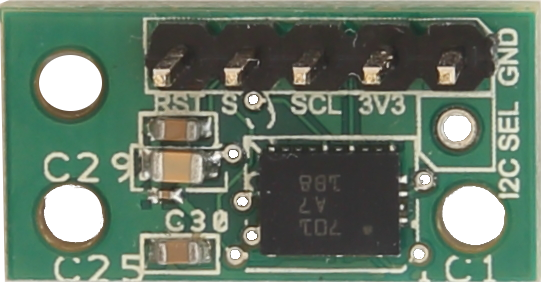 LIDAR, mjeri do 2 m (u idealnim okolnostima) milimetarskom točnošću. Logički nivoi i napajanje 3.3 V. I2C sučelje, promjenjiva adresa. Dupont 0.1" pinovi. Čip ST VL53L0X.