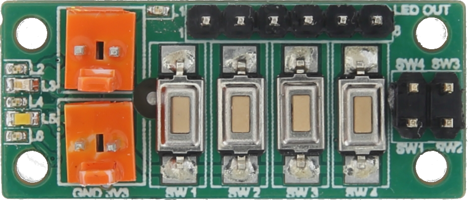 Pločica s 4 tipkala i 6 LEDova raznih boja. Napajanje i logički signali 3.3 V. Predviđeno za spajanja na digitalne ulaze i izlaze mikrokontrolerske pločice. Svi pinovi su Dupont 0.1".