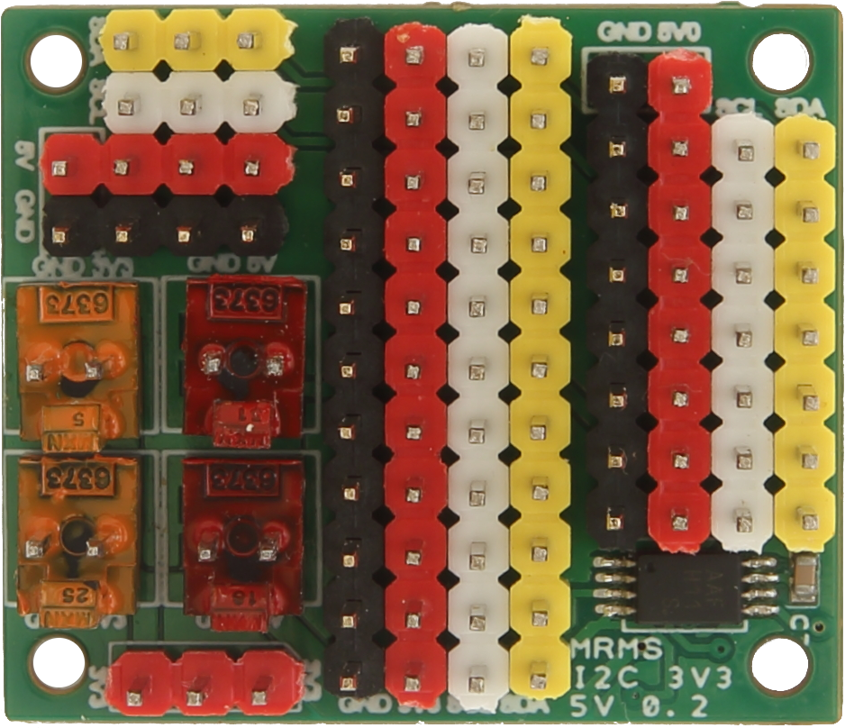 Razvod I2C sabirnica i napona 3.3 i 5 V. Čip za prilagodbu napona (level shifter) između 3.3 i 5 V I2C sabirnica. Svi pinovi su na 0.1" razmaku.