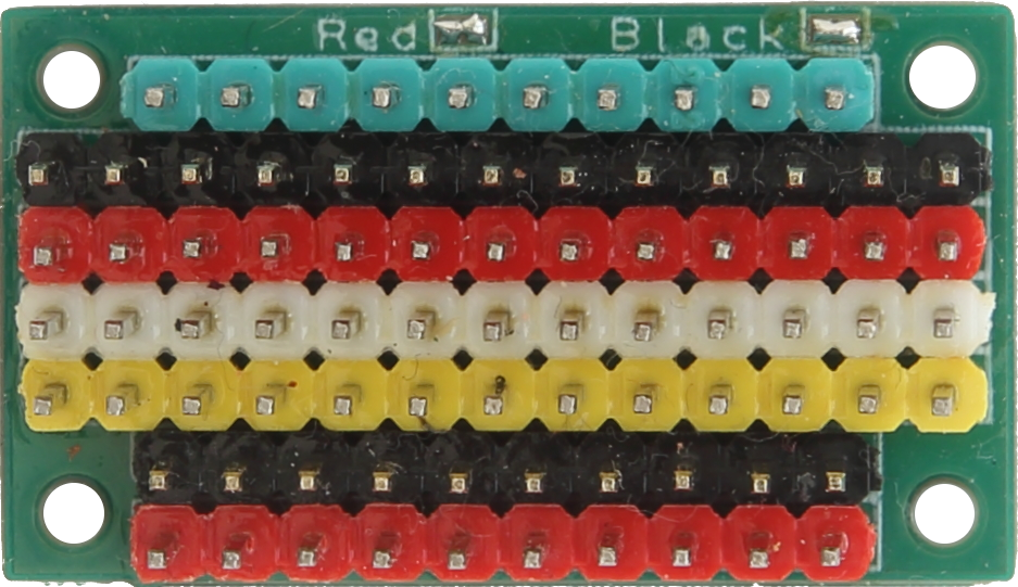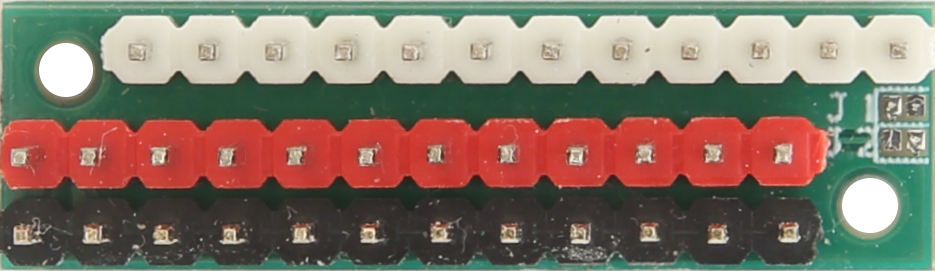 3 međusobno spojena niza Dupont (0.1") pinova. Crno je obično zemlja, crveno pozitivni napon i bijelo za proizvoljnu namjenu.